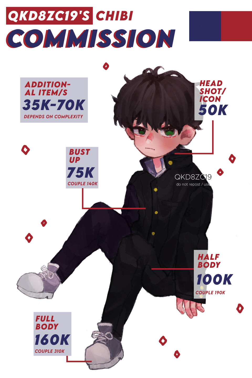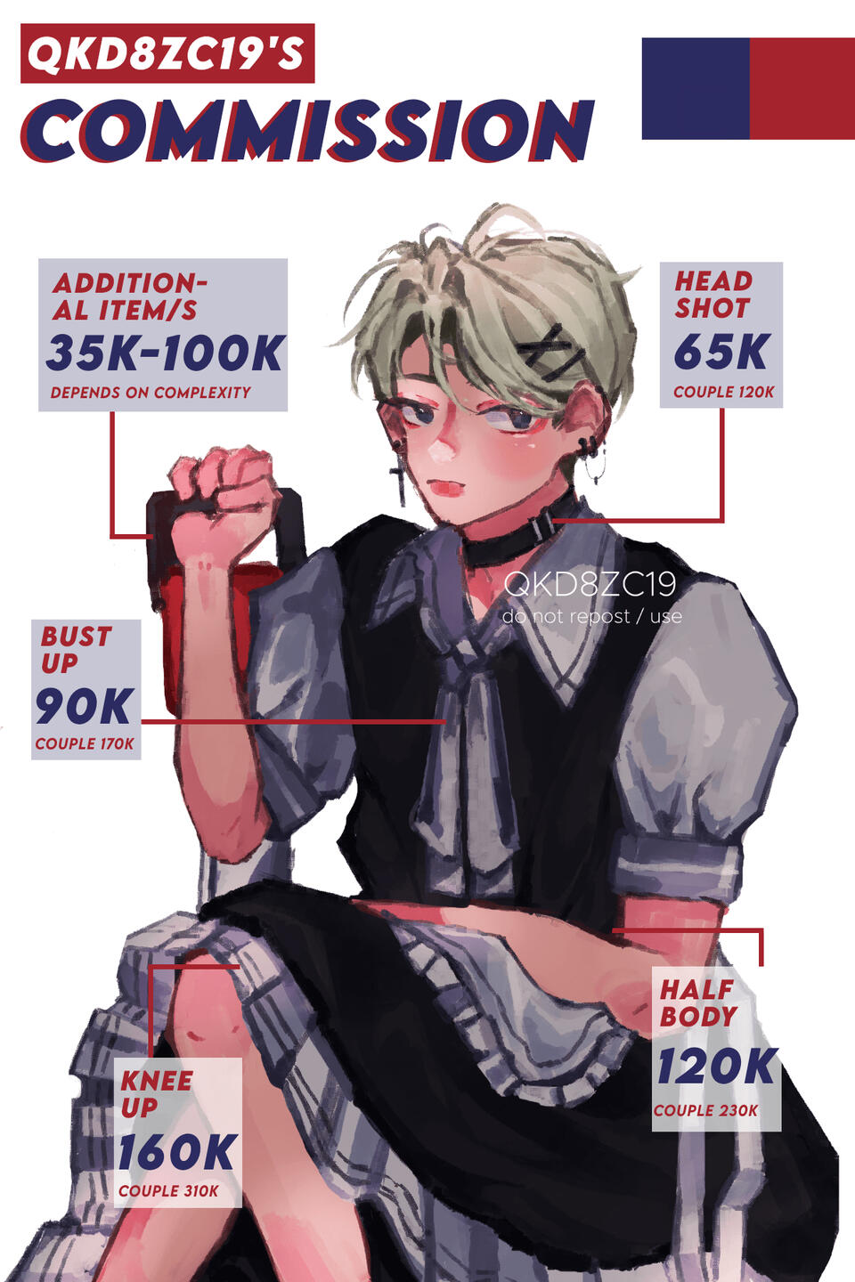 payment total diatas 150K WAJIB dp 50% sebelum mulai sketchmohon kirim referensi sejelas mungkin (saya berhak untuk meminta tambahan referensi apabila dirasa kurang)solid color background onlywaktu pengerjaan 2 - 3 minggumaksimal 2 chara per-canvasdetailed chara = 1.5 × harga awalsize canvas 2000 - 3000 px resolusi 350 dpi / sesuai requestfile hasil jadi tanpa wm akan dikirim via email / gdrive. 3 file : png, jpg, transparentsaya punya hak untuk men-cancel commission apabila tidak sesuai dengan kemampuan sayahak cipta commission TETAP menjadi milik sayaDILARANG MENGGUNAKAN HASIL COMMISSION UNTUK KEGIATAN KOMERSIL APAPUNDILARANG MENGAKUI HASIL COMMISSION SEBAGAI KARYA ANDA